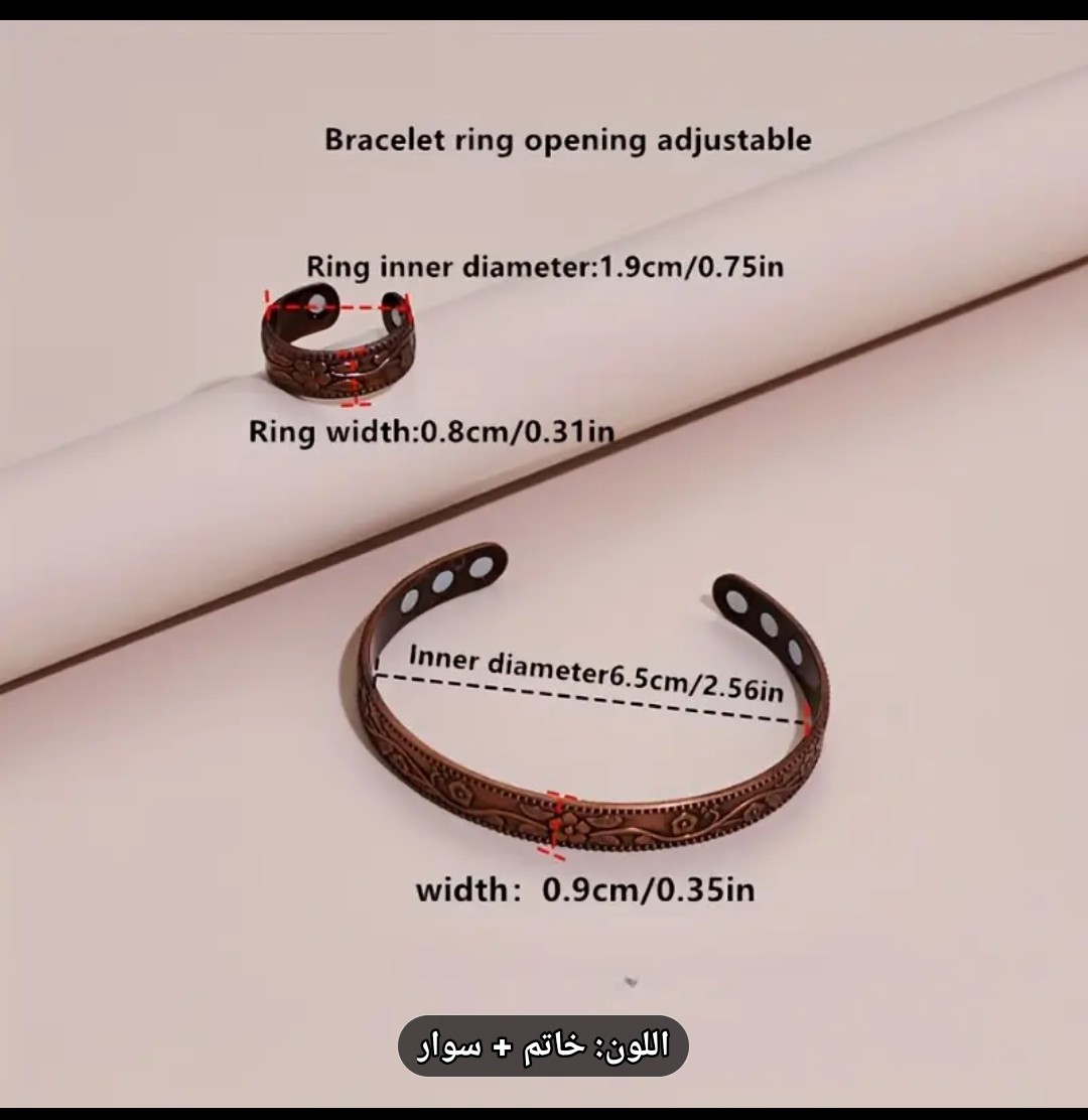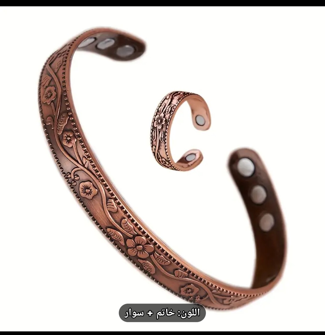الطقم مكوّن من أسورة نحاس أنيقة + خاتم نحاس مغناطيسي، بتصميم بسيط ومميز، ومزود بمغناطيس داخلي يساعد على تعزيز الإحساس بالطاقة والتوازن العام.