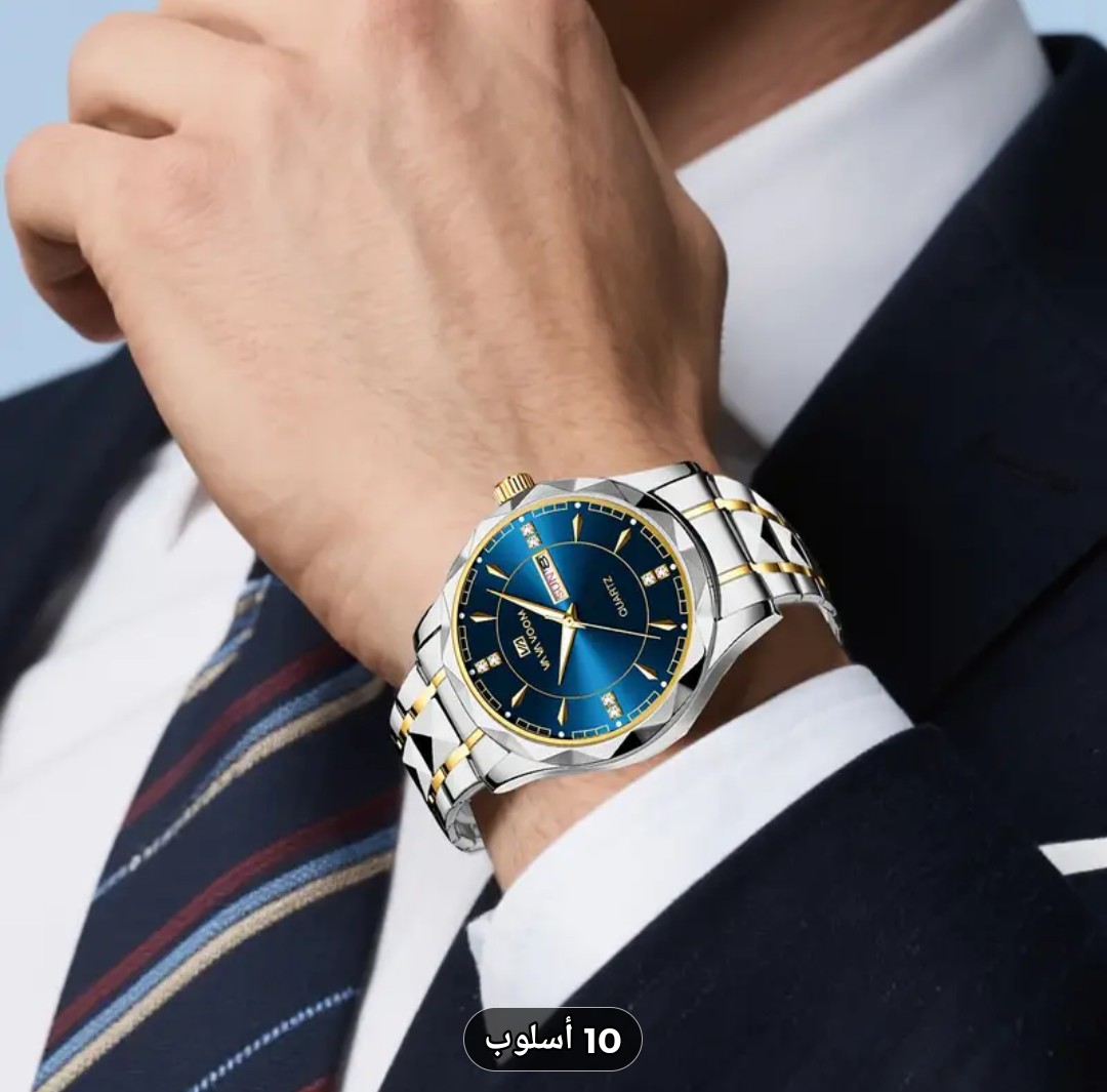 ساعة يد كلاسيك بتصميم أنيق وبسيط، تجمع بين اللون السلفر الهادئ والميناء الأزرق الجذاب، مناسبة للي بيحب المظهر المرتّب من غير تكلف.